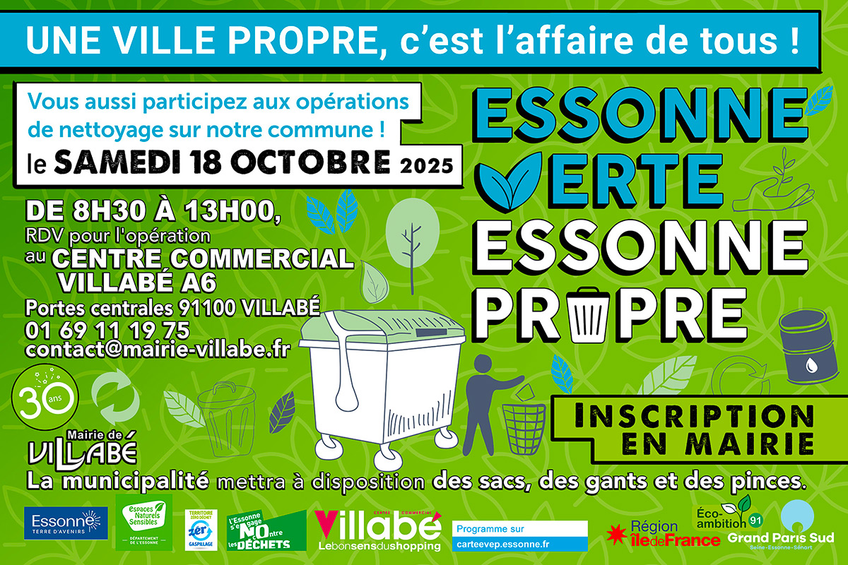 La commune de Villabé s’engage une nouvelle fois pour l’environnement en participant à l’opération Essonne Verte Essonne Propre, une initiative citoyenne organisée en partenariat avec le Département de l’Essonne. Rendez-vous est donné le samedi 18 octobre 2025 à 8h30, au niveau du centre commercial carrefour Villabé A6.